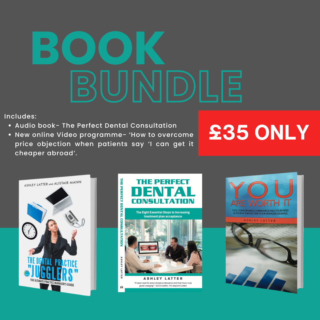 - Ashley Latter’s Book “The Perfect Dental Consultation” The Eight Essential Steps to increasing treatment plan acceptance (normally £15)